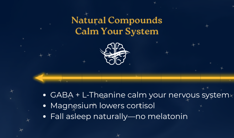 Gamma-Aminobutyric Acid (GABA) is a neurotransmitter that promotes relaxation and sleep by inhibiting nerve activity in the brain, helping to quiet the mind for deep, uninterrupted sleep.