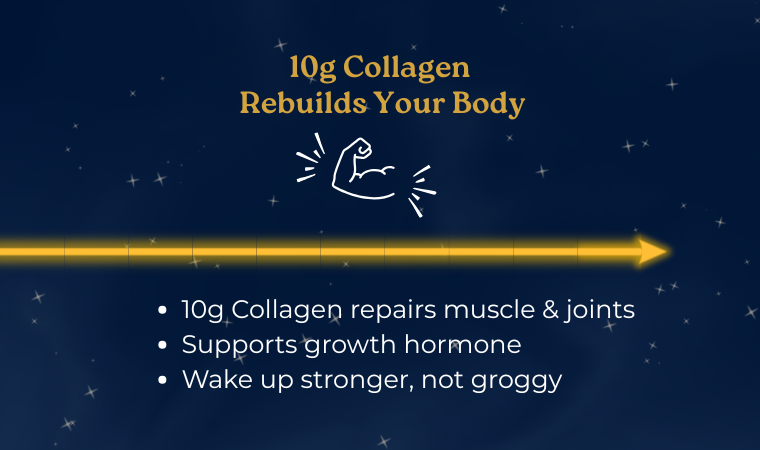 Collagen is rich in glycine, an amino acid known for its calming effects on the brain. Glycine acts as an inhibitory neurotransmitter, reducing nerve activity and promoting relaxation. Studies have shown glycine can lower core body temperature, important for deep sleep, and reduce next-day fatigue.